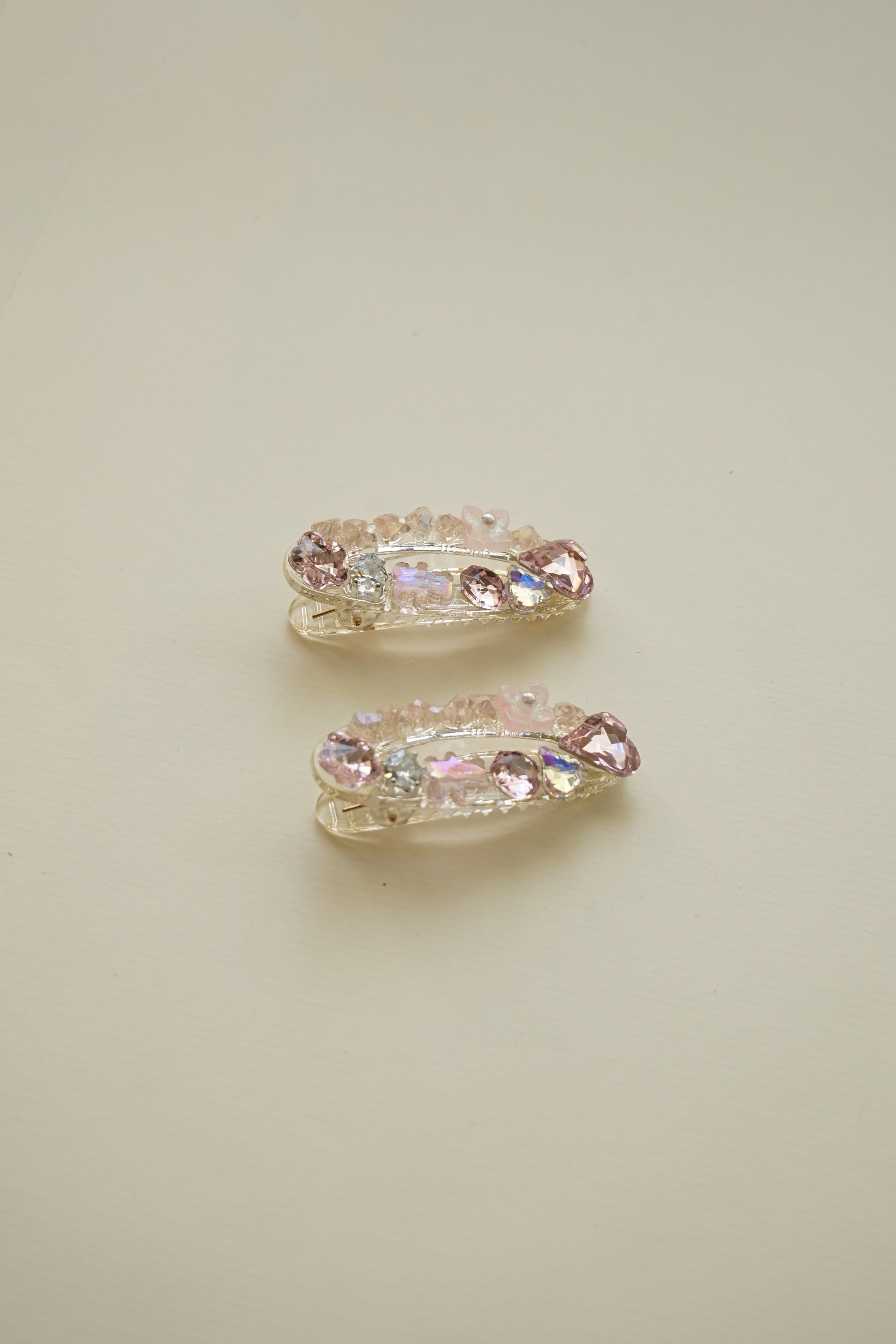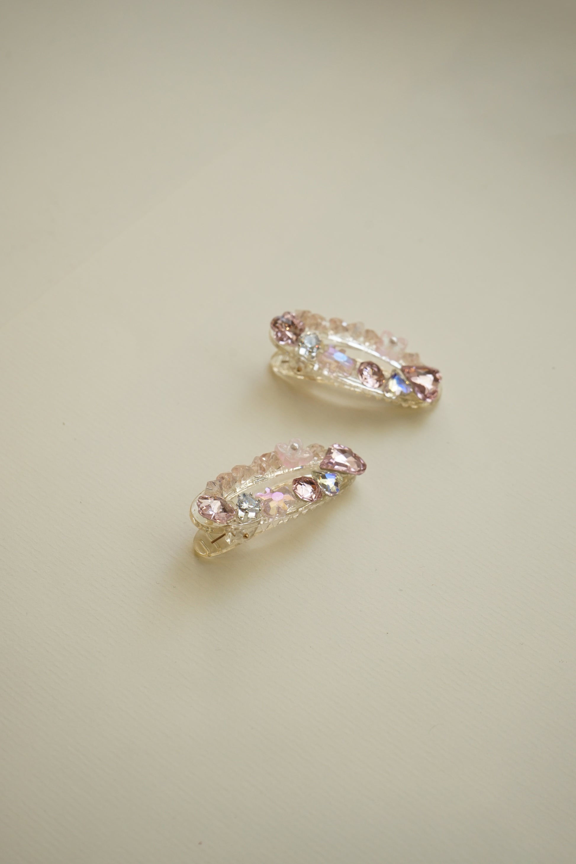 A delicate blush-toned clip, adorned with fine shimmering beads that catch the light with every movement. Minimal yet refined, it adds a soft glow to your hair — effortlessly elevating any look.