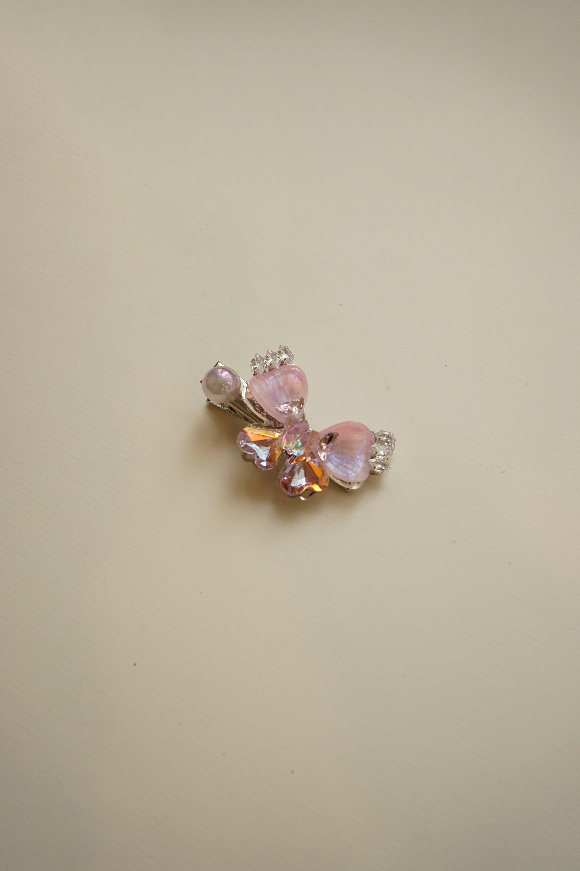 A delicate butterfly-shaped clip adorned with blush-toned crystals and subtle iridescent details that catch the light with every movement. Soft yet radiant, it brings a gentle glow and a touch of refined femininity to your look.